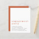 A value for money BUDGET alternative on a smaller size 4.5 x 5.6” semi-gloss 110lbs weight, which is of similar thickness to a postcard (however is not suitable to use as a postcard.). PLEASE NOTE there is ONE invite per sheet. Budget Simple Terracotta Engagement Party Invite. The header is large in stylish lowercase with the details beneath. Lots of white space at the top for a contemporary feel! Easily personalise the text to your own details.