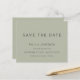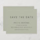 Simple Text Soft Sage Green Save The Date. A budget price SMALLER 4.5” x 5.6” alternative. Available in a SEMI-GLOSS 110 lb CARD STOCK which is the default option (thicker for invitations), OR a SATIN FINISH 80 lb THINNER PAPER STOCK (ideal for enclosures). Envelopes are an optional extra and are slightly larger than the card size. Simple elegance with Save The Date in a modern set script.The rest of the text you can easily personalise.Shown here in black on soft pale sage green however the text and background colors can be changed if you wish via the customise further option.