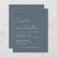 Budget Minimalist Dark Dusty Blue Slate Typewriter and Script Typography Wedding Invitation with RSVP website details.