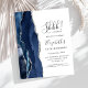 The left-hand edge of this elegant surprise birthday party invitation features a navy blue watercolor agate border trimmed with faux silver glitter. The customizable text combines handwriting, copperplate and italic fonts in charcoal gray on a white background. The reverse side features a matching navy blue and silver agate design.