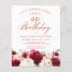 Red roses and blush pink peonies are nestled in dark green leaves on this beautiful and unique birthday invitation.