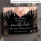 A black background decorated with blush, rose gold faux glitter drips, sparkles, and balloons. Personalize and add a date and name/age. The text: Save the Date is written with a large trendy hand lettered style script.