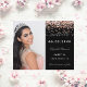 On front: Add a vertical size photo. A black background color, decorated with rose gold faux glitter dust. Personalize and add a name and details.