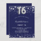 A modern, stylish and glamorous invitation for a Sweet 16, 16th birthday party. A navy blue background, decorated with faux silver stars. Personalize and add your name and party details. Number 16 is written with a balloon style font.