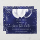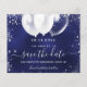 A girly and trendy Save the Date card for a Sweet 16, 16th birthday party. A navy blue uneven colored background. Decorated with faux silver glitter and white balloons. The text: Save the Date is written with a large trendy hand lettered style script.