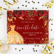 A girly and trendy Save the Date card for a Sweet 16, 16th birthday party. A stylish red background decorated red roses, golden colored faux glitter sparkles and a dress. Personalize and add a date and name/age. The text: Save the Date is written with a large trendy hand lettered style script.