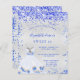 A faux silver looking background. Decorated with royal blue confetti, sparkles. Personalize and add a name and party details. The name is written with a hand lettered style script.