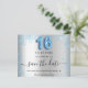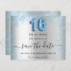 A girly and trendy Save the Date card for a Sweet 16, 16th birthday party. A faux silver looking background decorated with blue faux glitter dust. Personalize and add a date and name/age. The text: Save the Date is written with a large trendy hand lettered style script. Number 16 with a balloon style font.