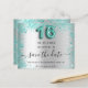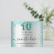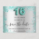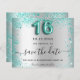 A girly and trendy Save the Date card for a Sweet 16, 16th birthday party. A faux silver looking background decorated with teal, green faux glitter dust. Personalize and add a date and name/age. The text: Save the Date is written with a large trendy hand lettered style script. Number 16 with a balloon style font.