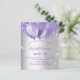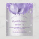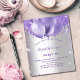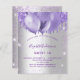 A stylish faux silver looking background. Decorated with violet, lavender colored faux glitter and balloons. Personalize and add a name, age and party details. The name is written with a hand lettered style script