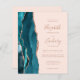 The left-hand edge of this elegant modern wedding invitation features a teal watercolor agate border trimmed with faux rose gold glitter. The customizable text combines dusty rose handwriting, copperplate and italic fonts on a blush pink background. The reverse side provides space for wedding details on a solid blush background, along with a QR code guests can scan to visit your website and RSVP, which saves the cost of printing and mailing separate RSVP cards.