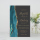 The left-hand edge of this elegant modern wedding invitation features a teal blue watercolor agate border trimmed with faux gold glitter. The customizable text combines gold-colored handwriting, copperplate and italic fonts on an off-black background. Add additional details on the back, along with a QR code to help your guests visit your wedding website.