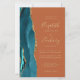 The left-hand edge of this elegant modern wedding invitation features a teal blue watercolor agate border trimmed with faux gold glitter. The customizable text combines gold-colored handwriting, copperplate and italic fonts on a burnt orange or rust background. Add additional details on the back, along with a QR code to help your guests visit your wedding website.