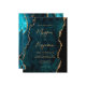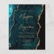 This elegant wedding invitation features a background image of teal blue watercolor agate trimmed with faux gold glitter. The customizable text combines gold-colored modern handwriting, copperplate and italic fonts. The reverse side features a coordinating teal and gold agate design.