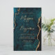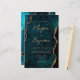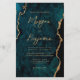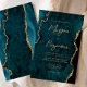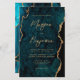 This elegant wedding invitation features a background image of teal blue watercolor agate trimmed with faux gold glitter. The customizable text combines gold-colored modern handwriting, copperplate and italic fonts. The reverse side features a coordinating teal and gold agate design.