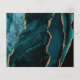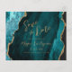 This elegant wedding save the date card features a background image of teal blue watercolor agate trimmed with faux gold glitter. The customizable text combines gold-colored modern handwriting, copperplate and italic fonts. The reverse side features a coordinating teal and gold agate design.