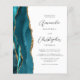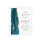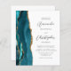 The left-hand edge of this elegant modern wedding invitation features a teal blue watercolor agate border trimmed with faux gold glitter. The customizable text combines charcoal gray script and sans serif fonts on a white background. The reverse side provides space for wedding details on a solid white background, along with a QR code guests can scan to visit your website and RSVP, which saves the cost of printing and mailing separate RSVP cards.