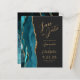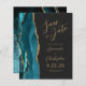 The left-hand edge of this elegant modern wedding save the date card features a teal blue watercolor agate border trimmed with faux gold glitter. The customizable text combines gold-colored script and sans serif fonts on a slate black background. The reverse side features a matching teal and gold agate design.