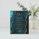 This elegant modern wedding menu features a teal blue watercolor agate border trimmed with faux gold glitter. The customizable text combines gold-colored handwriting script and copperplate fonts. The reverse side features a matching teal and gold agate design.