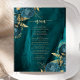 This elegant wedding menu features teal blue floral bouquets set off with gold faux foil greenery in two corners, on a background image of teal watercolor agate. The customizable text combines gold-colored serif and handwriting fonts. The reverse side features a matching teal and gold floral and agate design.