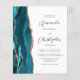 The left-hand edge of this elegant modern wedding invitation features a teal blue watercolor agate border trimmed with faux rose gold glitter. The customizable text combines charcoal gray script and sans serif fonts on a white background. The reverse side provides space for wedding details on a solid white background, along with a QR code guests can scan to visit your website and RSVP, which saves the cost of printing and mailing separate RSVP cards.
