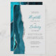 The left-hand edge of this elegant modern wedding invitation features a teal blue watercolor agate border trimmed with faux silver glitter. The customizable text combines teal handwriting with charcoal gray copperplate and italic fonts on a pale gray background. The teal and silver agate design is repeated on the back of the card.