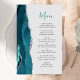 The left-hand edge of this elegant modern wedding menu features a teal blue watercolor agate border trimmed with faux silver glitter. The customizable text combines teal blue handwriting script with charcoal gray copperplate font on a pale gray background. The reverse side features a matching teal and silver agate design.