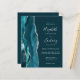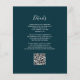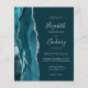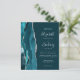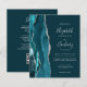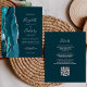 The left-hand edge of this elegant modern wedding invitation features a teal blue watercolor agate border trimmed with faux silver glitter. The customizable text combines handwriting, copperplate and italic fonts in silver gray on a dark teal background. The reverse side provides space for wedding details on a solid teal background, along with a QR code guests can scan to visit your website and RSVP, which saves the cost of printing and mailing separate RSVP cards.