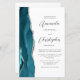The left-hand edge of this elegant modern wedding invitation features a teal blue watercolor agate border trimmed with faux silver glitter. The customizable text combines charcoal gray script and sans serif fonts on a white background. The reverse side provides space for wedding details on a solid white background, along with a QR code guests can scan to visit your website and RSVP, which saves the cost of printing and mailing separate RSVP cards.