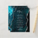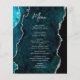 This elegant modern wedding menu features a teal blue watercolor agate background trimmed with faux silver glitter. The customizable text combines silver gray handwriting script and copperplate fonts. The reverse side features a matching teal and silver agate design.