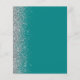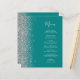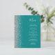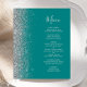 The left-hand edge of this elegant modern wedding menu features a silver faux glitter border. The customizable text combines silver gray handwriting script and copperplate fonts on a teal blue background. The reverse side features a matching teal and silver design.