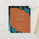A teal blue watercolor agate design trimmed with faux gold glitter appears in two corners of this elegant design. Personalize it with the couple's names in gold-colored handwriting script over a large ampersand. Add the wedding details in gold-colored copperplate and italic fonts on a burnt orange or rust background. The reverse side features a matching teal and gold agate design.