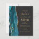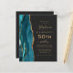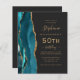 The left-hand edge of this elegant modern 50th birthday party invitation features a teal blue watercolor agate border trimmed with gold faux glitter. The customizable text combines gold-colored handwriting, copperplate and italic fonts on a slate black background. Add RSVP instructions on the back of the card, along with a QR code guests can scan to respond online.