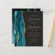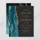 The left-hand edge of this elegant modern wedding invitation features a teal watercolor agate border trimmed with faux gold glitter. The customizable text combines gold-colored script and sans serif fonts on a slate black background. The reverse side features a matching teal and gold agate design.