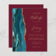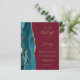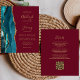 Save the cost of printing and mailing separate RSVP cards with this elegant modern all-in-one budget wedding invitation. The left-hand edge features a teal blue watercolor agate border trimmed with gold faux glitter. The customizable text combines gold-colored handwriting, copperplate and italic fonts on a burgundy red background. The reverse side provides space for wedding details on a solid burgundy background, along with a QR code guests can scan to visit your website and RSVP.