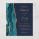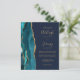 Save the cost of printing and mailing separate RSVP cards with this elegant modern all-in-one budget wedding invitation. The left-hand edge features a teal blue watercolor agate border trimmed with gold faux glitter. The customizable text combines gold-colored handwriting, copperplate and italic fonts on a navy blue background. The reverse side provides space for wedding details on a solid navy blue background, along with a QR code guests can scan to visit your website and RSVP.
