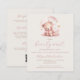This cute baby shower invitation features a sweet watercolor teddy bear in a pink dress surrounded by gold stars, above the words "we can bearly wait" in pink handwriting script. Personalize the text with the name of the mom-to-be in pink script and the details in sans serif font on a beige background. The reverse side provides space for diaper raffle, books for baby, and registry details, along with a convenient QR code guests can scan to visit the registry. Ideal for a girl's baby shower. NOTE: Envelopes are not automatically included with these budget invitations, so please remember to choose the "blank white envelopes" option!