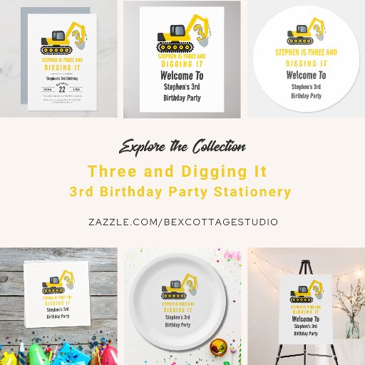 Celebrate your little builder’s big day with this fun construction-themed stationery collection! Perfect for a 3rd birthday party, the design features a bright yellow digger hard at work with the playful phrase “three and digging it.” Ideal for kids who love trucks and construction sites. A great way to set the tone for a fun-filled celebration!