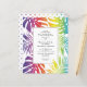 Rainbow colors tropical leaves gay lesbian wedding invitation with QR code. It features a colorful pattern of tropical monstera and palm leaves in rainbow colors and your text in a frame with black border. The back includes a the QR code for online RSVP and colorful polka dot pattern in rainbow colors.
