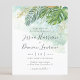 A trendy elegant tropical style wedding invitation featuring green and gold watercolor palm and monstera leaves with modern calligraphy.