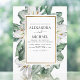 Budget Tropical Magnolia Flowers with Floral Greenery Palm and Faux Gold Foil Geometric Border Spring or Summer Wedding Invitations - includes beautiful and elegant script typography with modern tropical botanical flowers and greenery for the special Wedding day celebration.