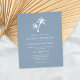 This budget coastal wedding invitation is a smaller size printed on cheaper paper, without an envelope. The simple minimal dusty blue tropical beach wedding invitation features two palm trees at the top, with classic elegant text.