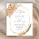 This trendy wedding invitation features a gold geometric frame decorated with watercolor dried tropical palm leaves and pampas grass in shades of beige and muted green. Customize the charcoal gray text with your wedding details. The reverse side is a coordinating shade of solid peach-tinted beige.