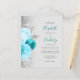 The left-hand edge of this elegant modern wedding invitation features a floral bouquet in shades of turquoise and light blue, trimmed with silver faux foil and faux glitter foliage and sprinkled with silver faux glitter. The customizable text combines turquoise handwriting script with charcoal gray copperplate and italic fonts on a pale silver gray background. Add additional details on the back, along with a QR code to help your guests visit your wedding website.