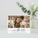 Budget Elegant Modern Black and White Minimalist Calligraphy Script 5 Photo Collage Wedding Save The Date Thin Cards. This romantic delicate design perfect for modern wedding. Features 5 (five) grid photo collage, a whimsical calligraphy in hand lettered style swash tail font. Easy to personalize it with your wedding details and pictures. Low budget cheap affordable cards.