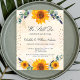 A white and golden watercolored background decorated with sunflowers, eucalyptus greenery and golden leaves and golden hearts sprinkle. Personalize and add your names and party details.