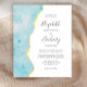 The left-hand edge of this elegant modern wedding invitation features an aqua blue watercolor agate border trimmed with faux gold foil. The customizable text combines handwriting, copperplate and italic fonts in charcoal gray on a white background. The reverse side features a matching aqua and gold watercolor agate design.