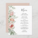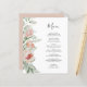 The left-hand edge of this romantic wedding menu features watercolor floral bouquet of peach and blush flowers and greenery. The customizable text combines handwriting, copperplate and italic fonts in charcoal gray on a white background. The reverse side features a coordinating solid color.