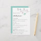 Watercolor Leaves Script Wedding Menu. A budget price size 5.5” x 8.5”, on an elegant 110 lb LINEN stock – for a luxury feel at great value, this is perfect for menus, as well as invitations and programs etc. This budget size alternative is also available in other paper choices. The SEMI-GLOSS 110 lb card stock is about the same thickness as a postcard, so also works well for invitations. The FELT 100 lbs paper is buff colored, NOT white, so adds a rustic touch. The MATTE 80lbs paper stock is bright white, for crisp printing, great for your menus and programs, whilst the SATIN 80lbs paper is thin and light, ideal for enclosures. PLEASE NOTE THE OPTIONAL ENVELOPES ARE A LITTLE BIGGER IN SIZE AT 6.75” x 9” approx. Contemporary style with an informal set handwritten style script for the header Menu and modern artsy watercolor leaves in pastel pink and teal at the top.. Easily personalise the rest of the text to your own details which includes alternatives for your vegan or vegetarian options. A coordinating teal background s on the back.