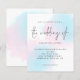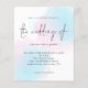 Watercolor Pink Blue Wedding Invitation. A budget price SMALLER 4.5” x 5.6” alternative. Available in a SEMI-GLOSS 110 lb CARD STOCK which is the default option (thicker for invitations), OR a SATIN FINISH 80 lb THINNER PAPER STOCK (ideal for enclosures). Envelopes are an optional extra and are slightly larger than the card size. A stylish set typography in black for the main heading the Wedding Of complementing the rest of the text which you can easily personalise, is all overlaid onto a beautiful pastel watercolor wash background from two corners in shades of pink and blue.